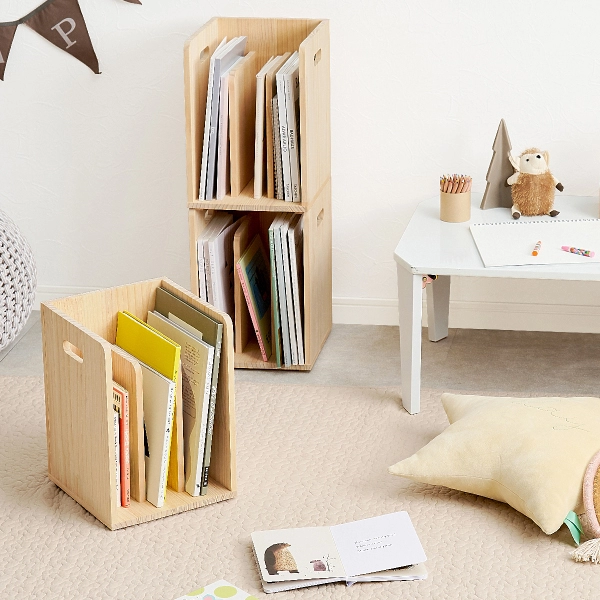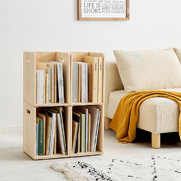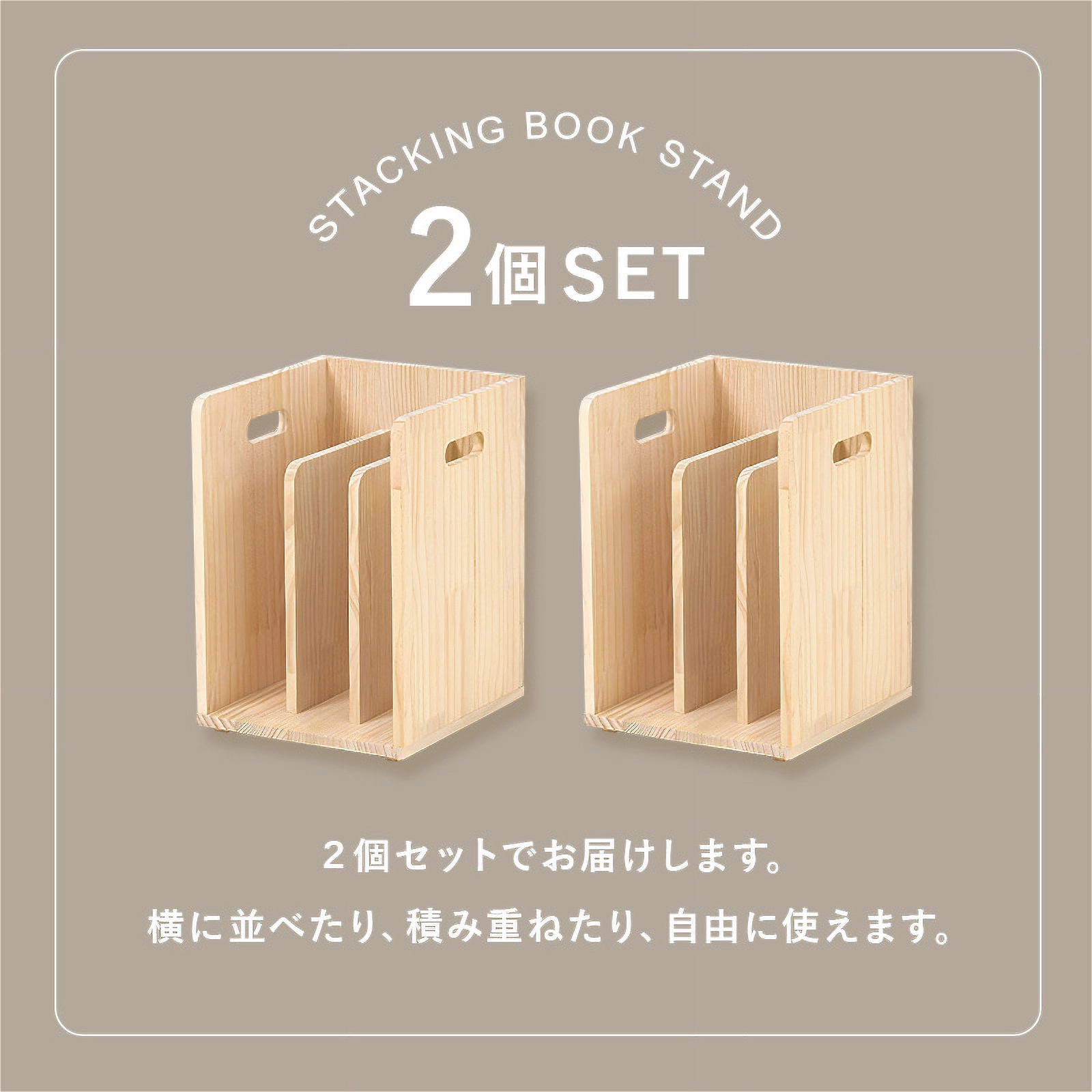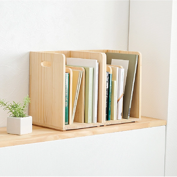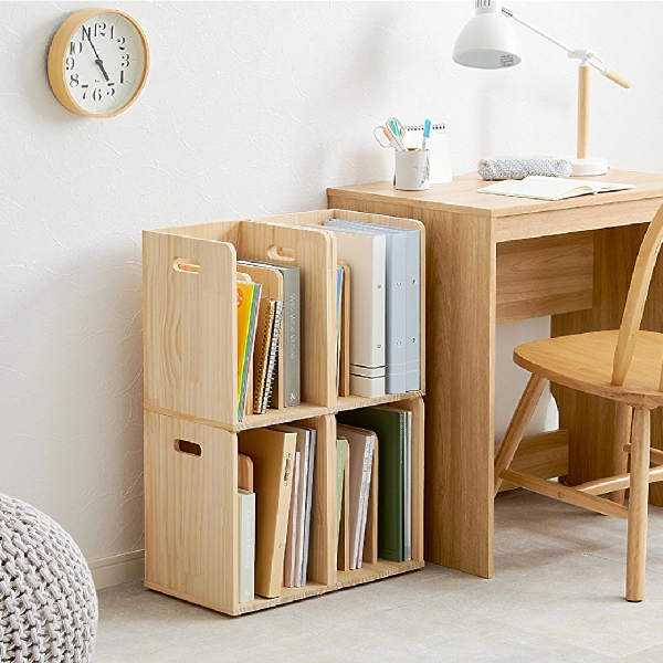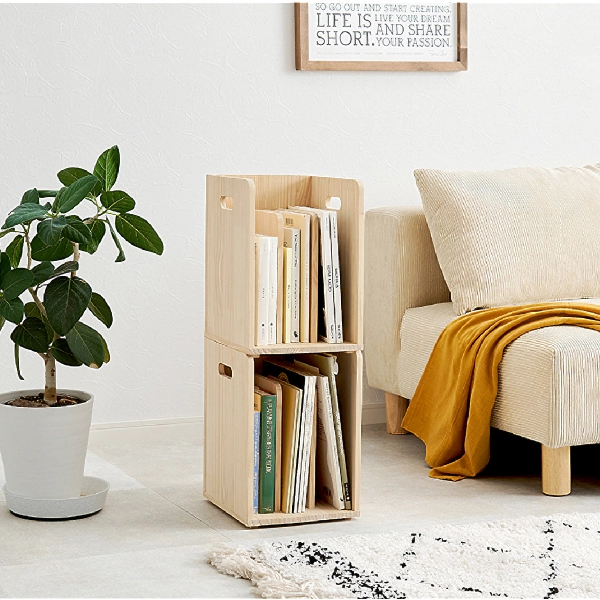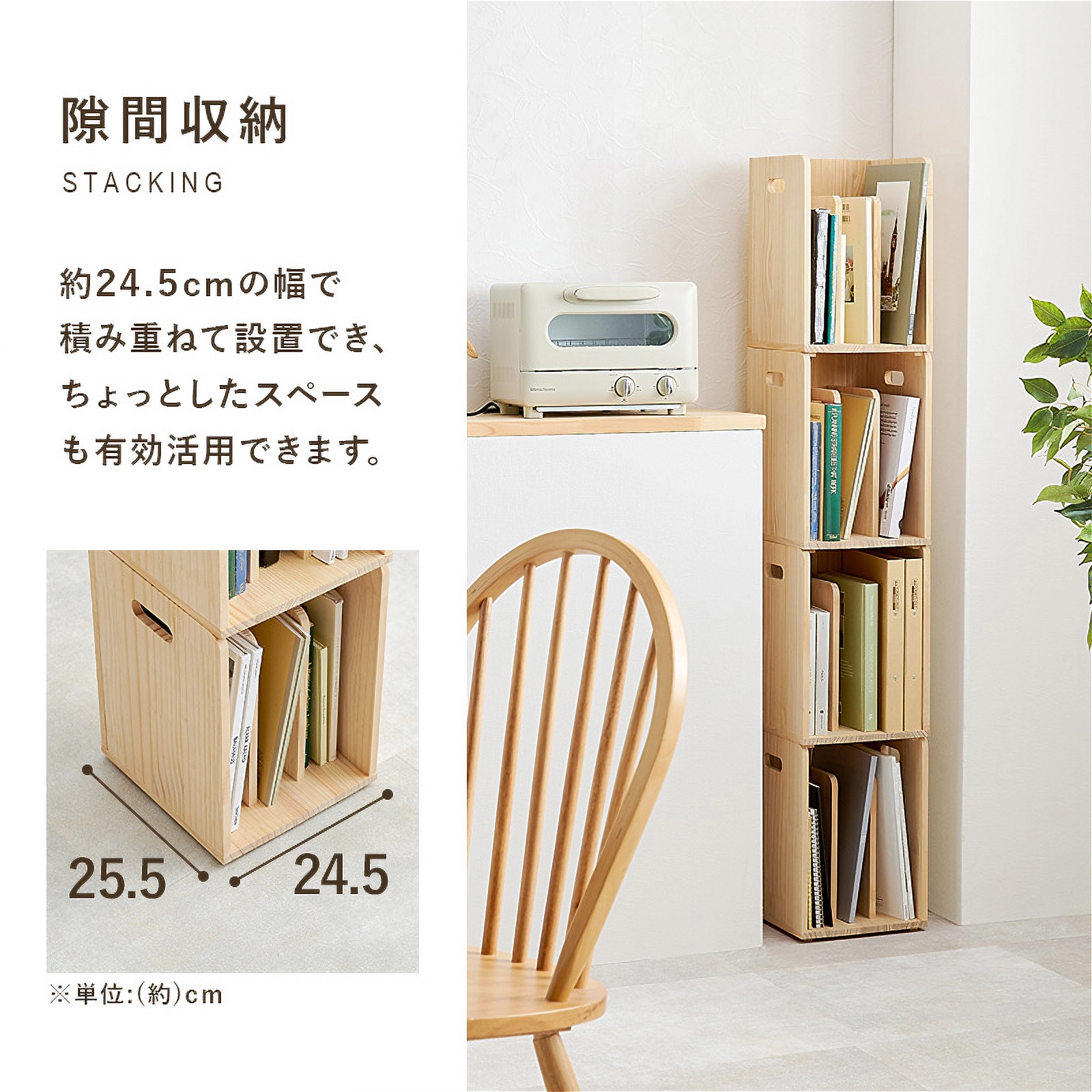 ナチュラルな質感と使いやすさを兼ね備えた、パイン材のブックラック。2個セットで重ねて使えるため、限られたスペースでも収納力をしっかり確保できます。