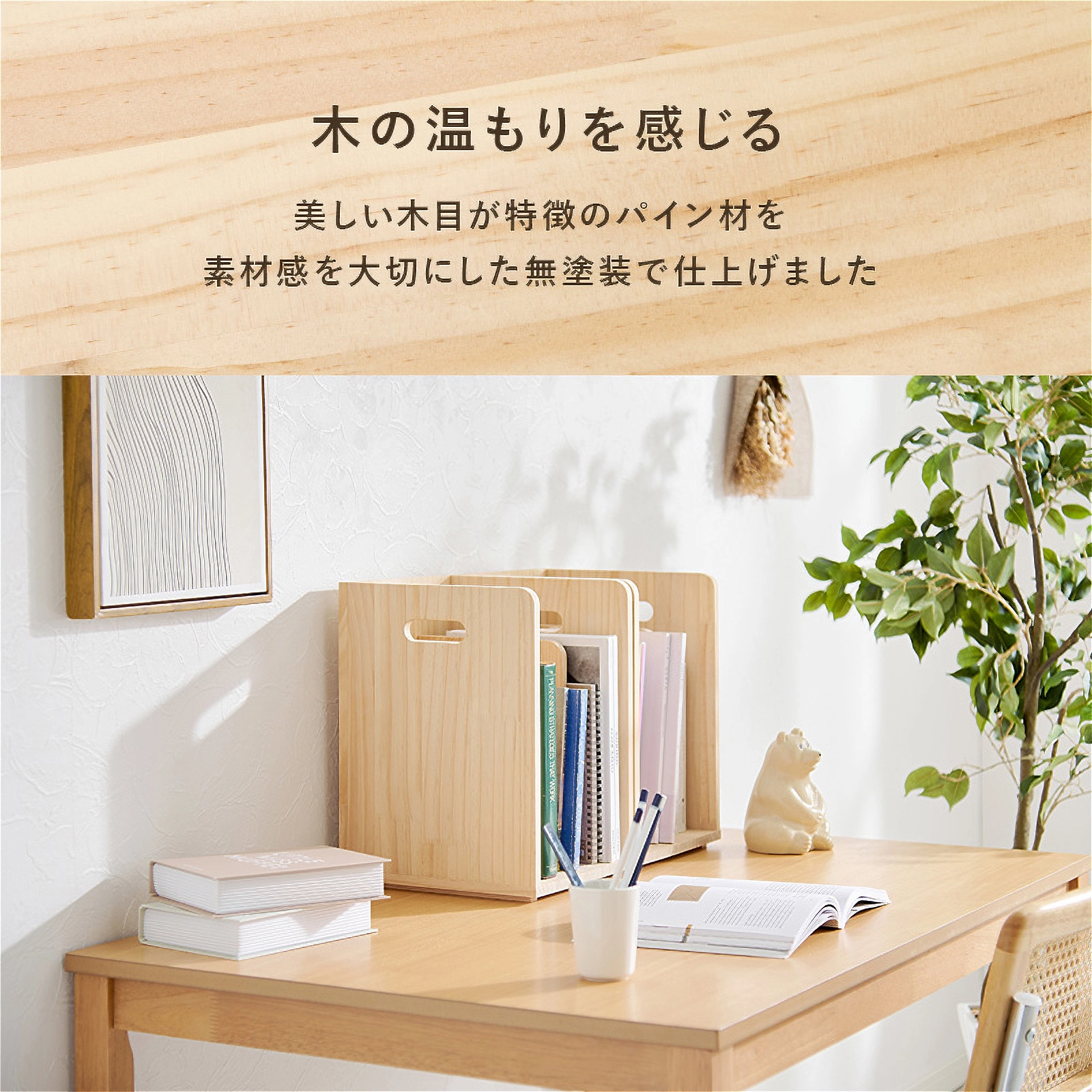 素材には無塗装の天然木パイン材を使用。木そのものの風合いや手触りが心地よく、ナチュラルインテリアにもしっかり馴染みます。組み立て不要の完成品なので、届いたその日からすぐに使えるのもポイントです。
