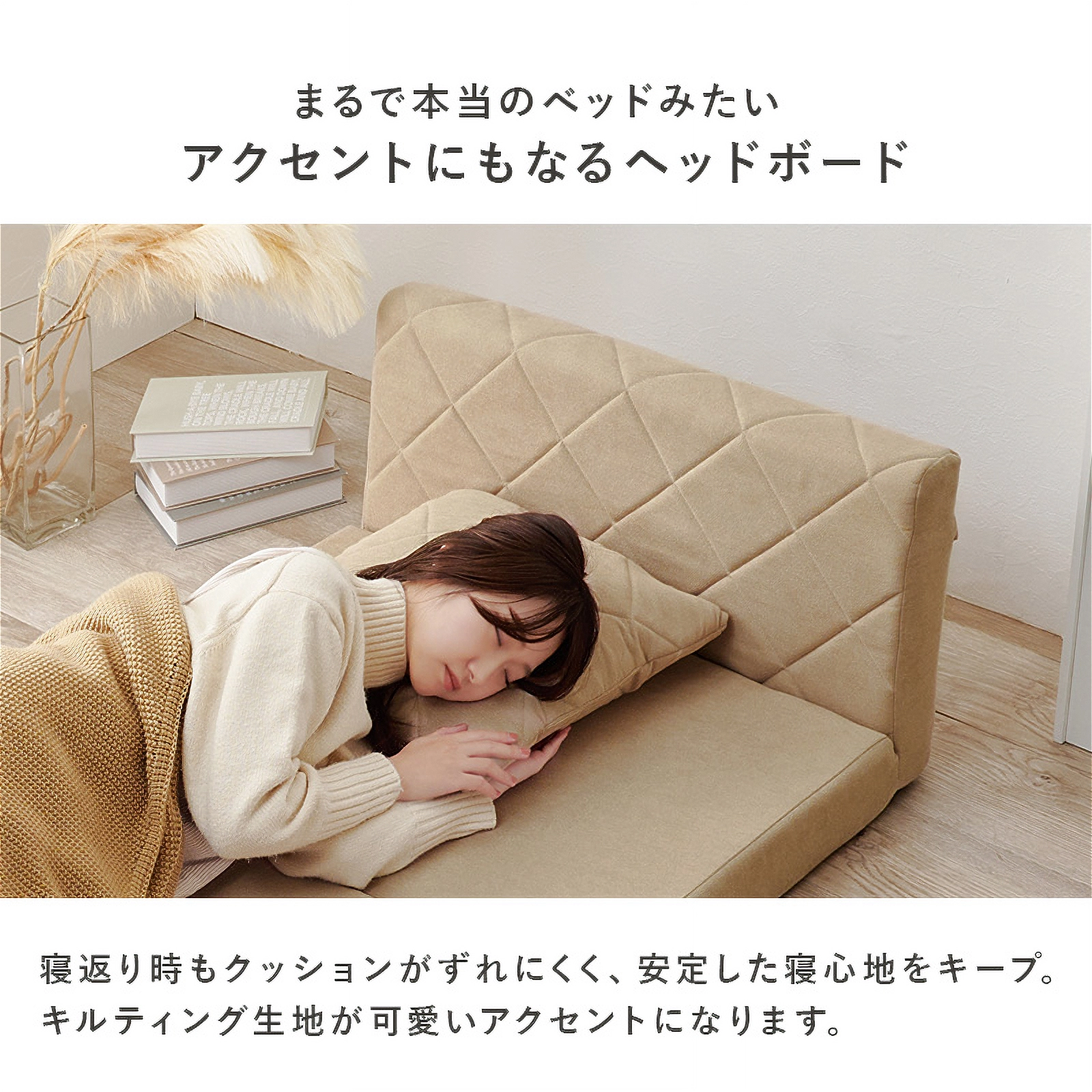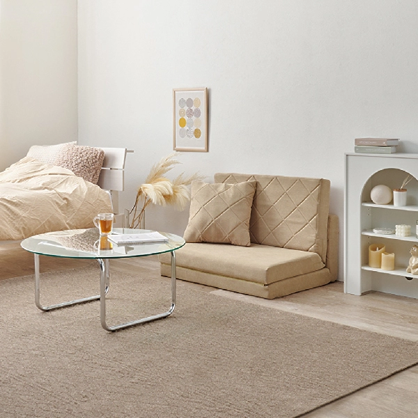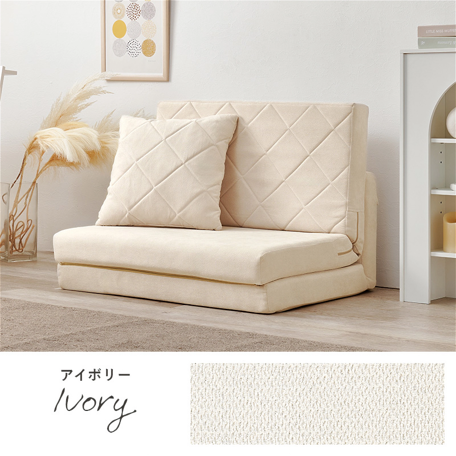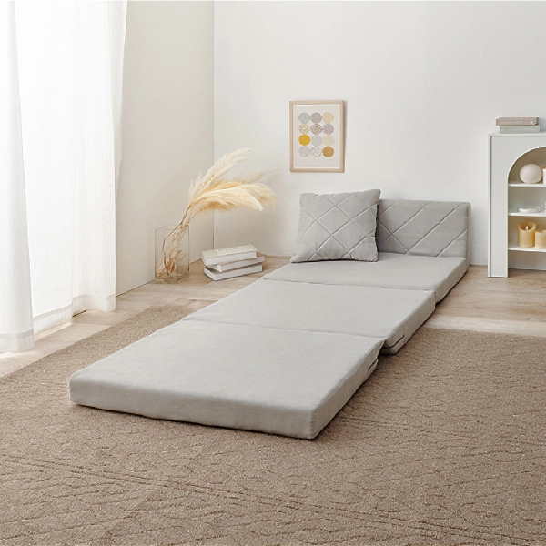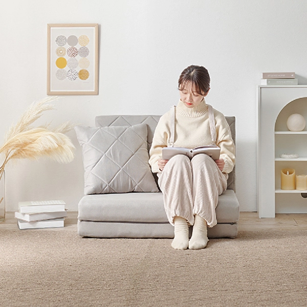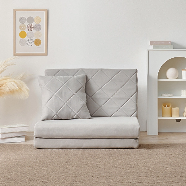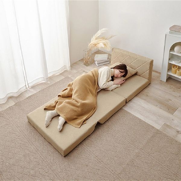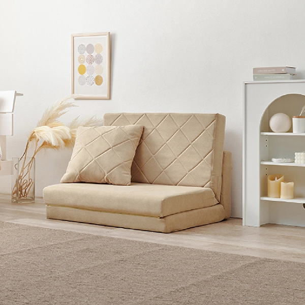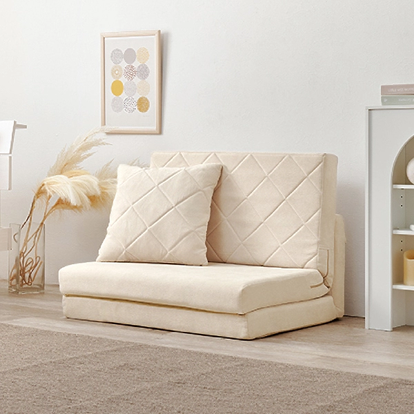 コンパクトながらも機能性とデザイン性を兼ね備えた「キルティングソファベッド」。女性一人でも簡単に扱える手軽さと、淡色の可愛らしいデザインで、お部屋を優しく彩ります。