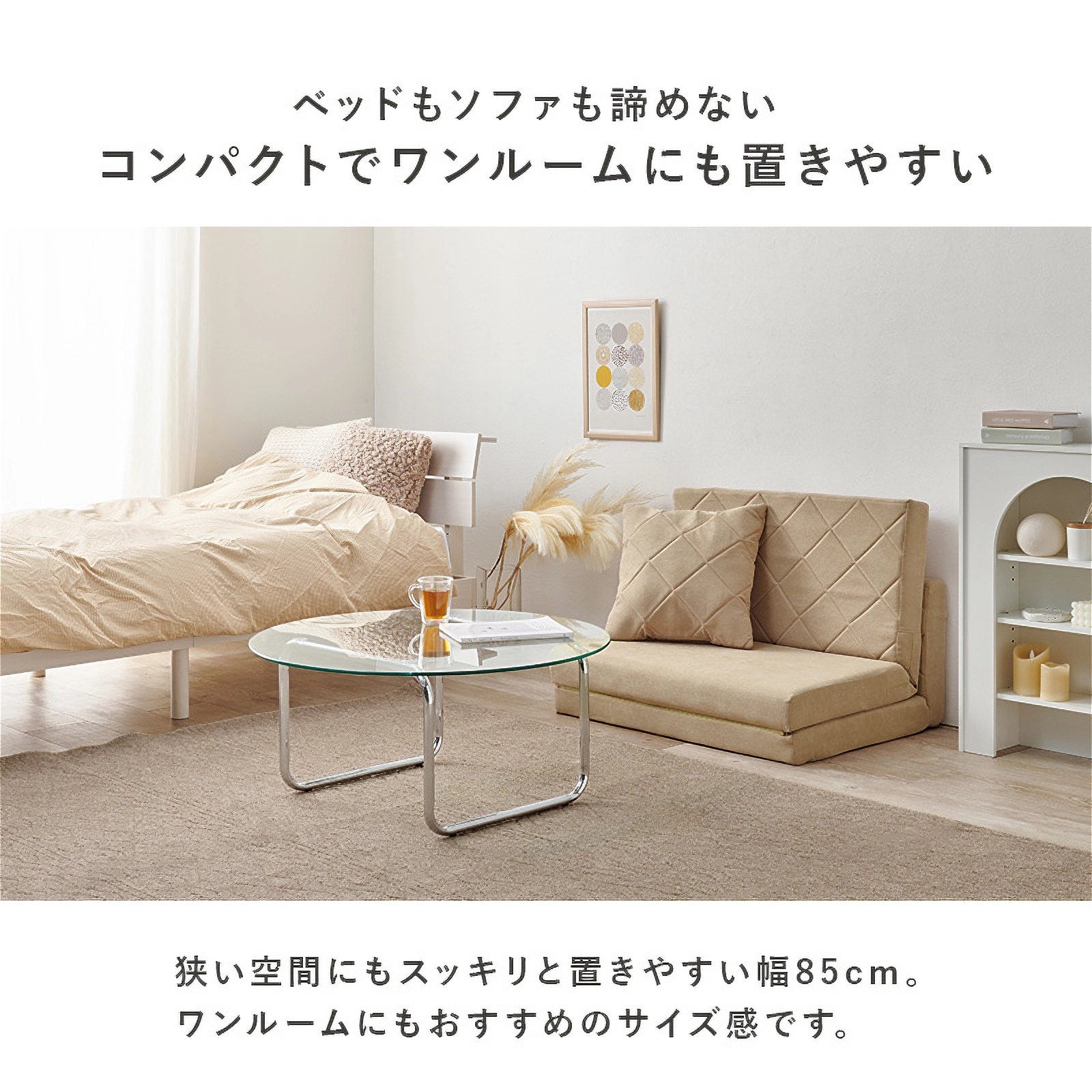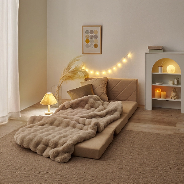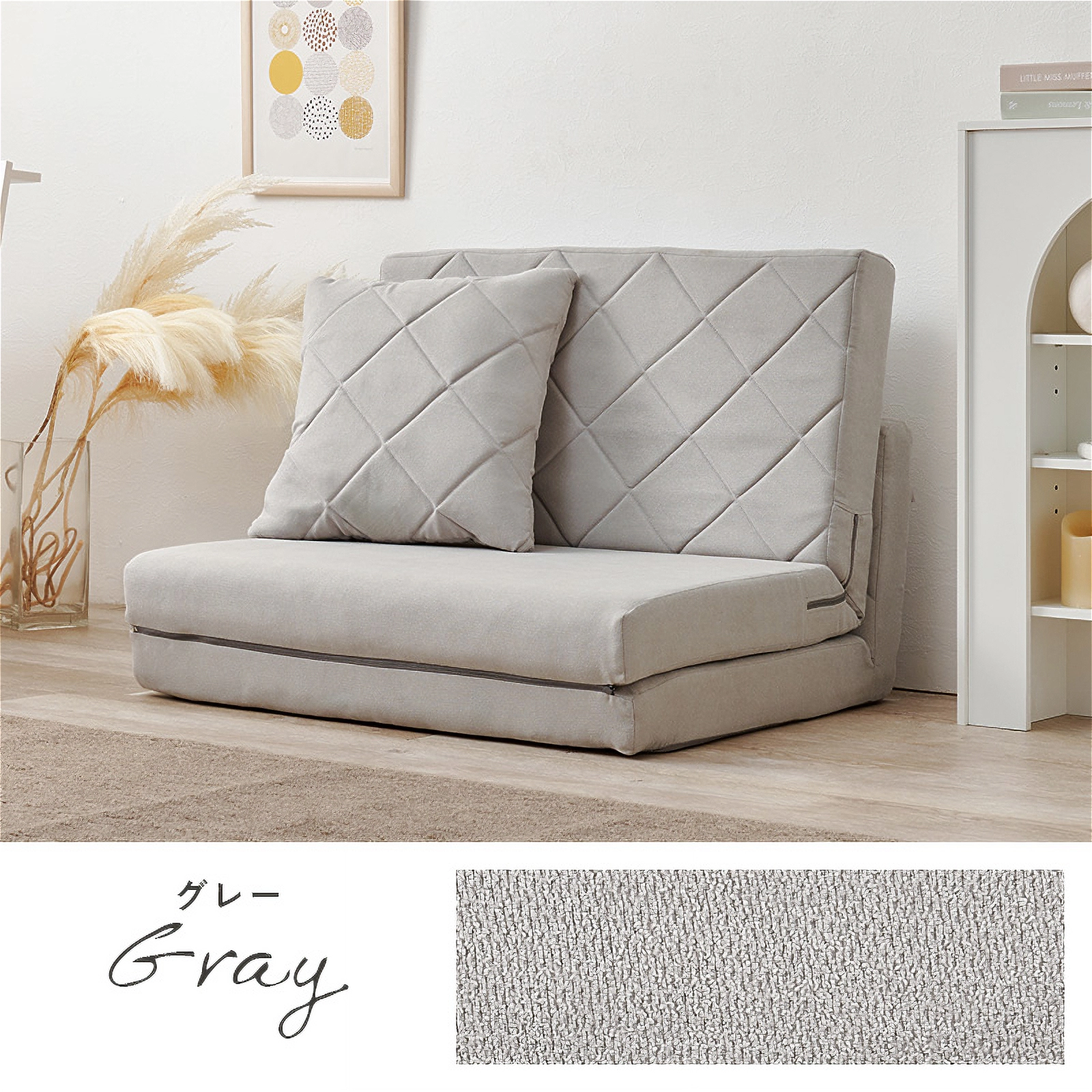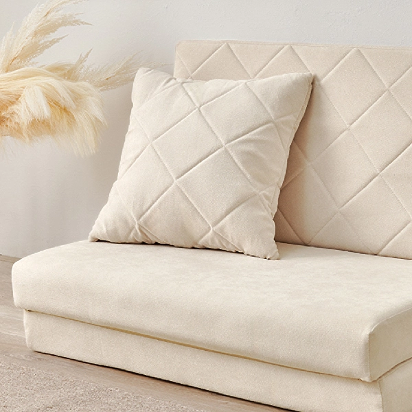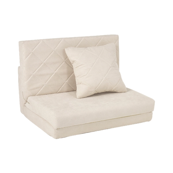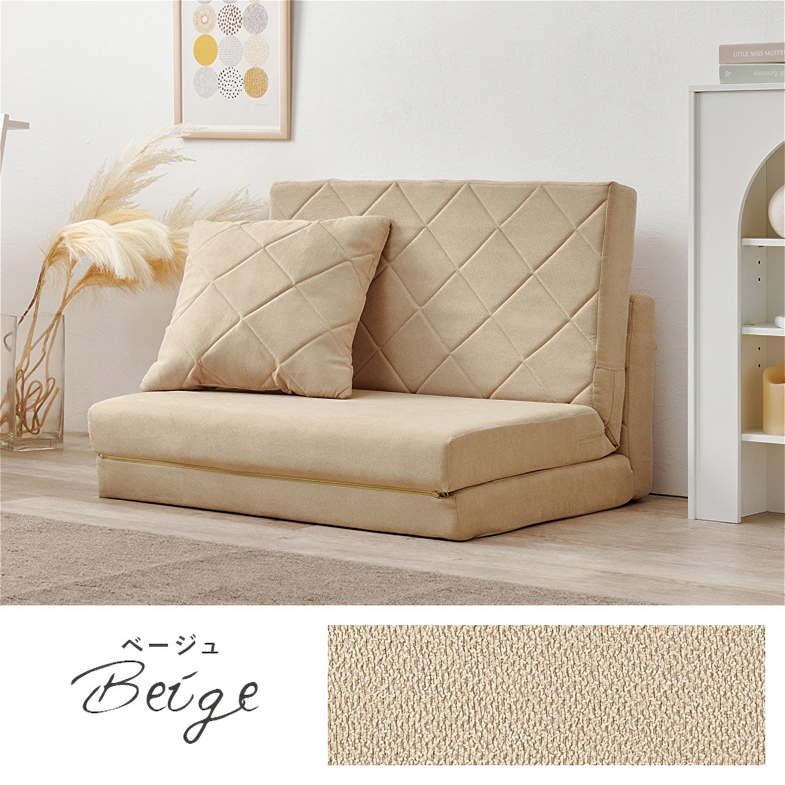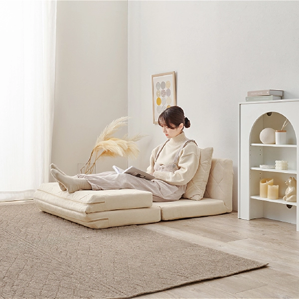 コンパクトながらも機能性とデザイン性を兼ね備えた「キルティングソファベッド」。女性一人でも簡単に扱える手軽さと、淡色の可愛らしいデザインで、お部屋を優しく彩ります。