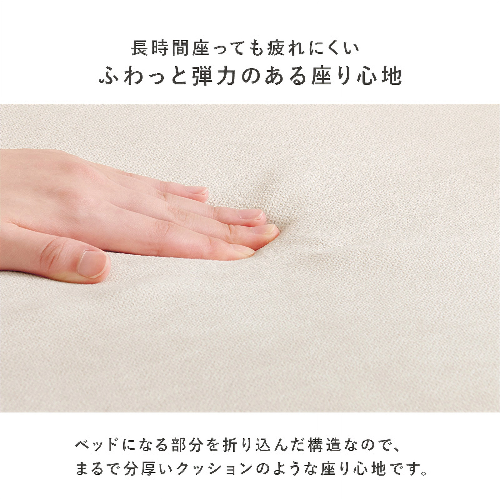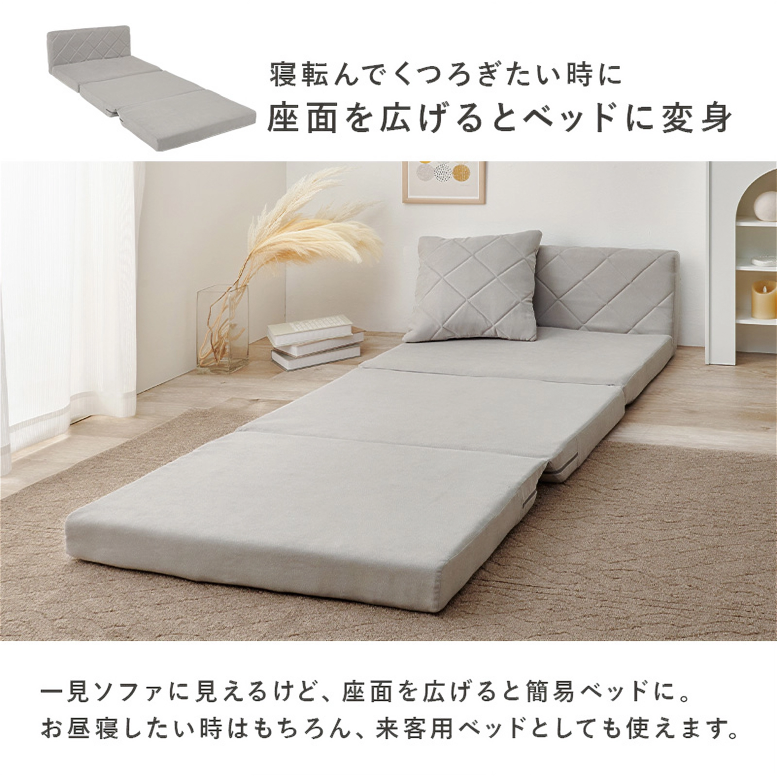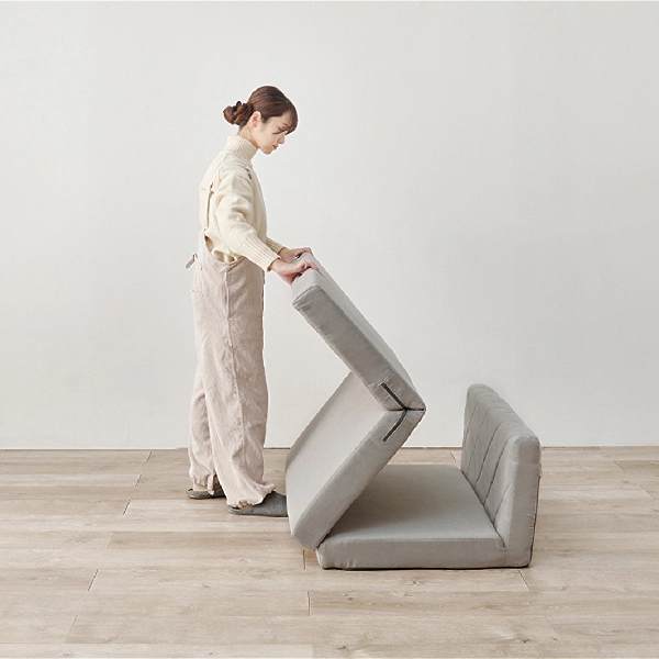 ソファとしてはもちろん、座面を広げれば簡易ベッドにも早変わり。女性でも簡単に形を変えられる手軽さで、急な来客やリラックスタイムにも大活躍です。