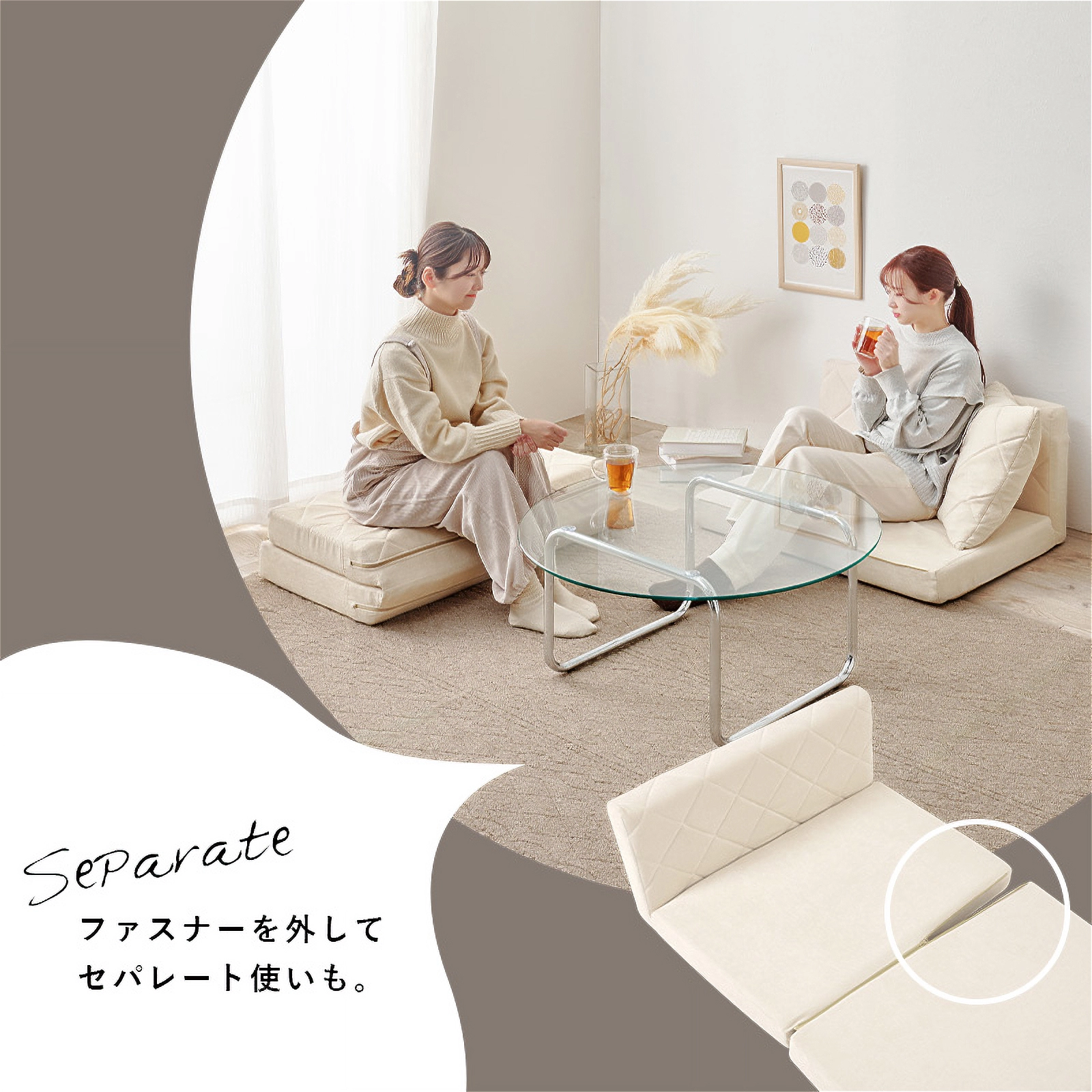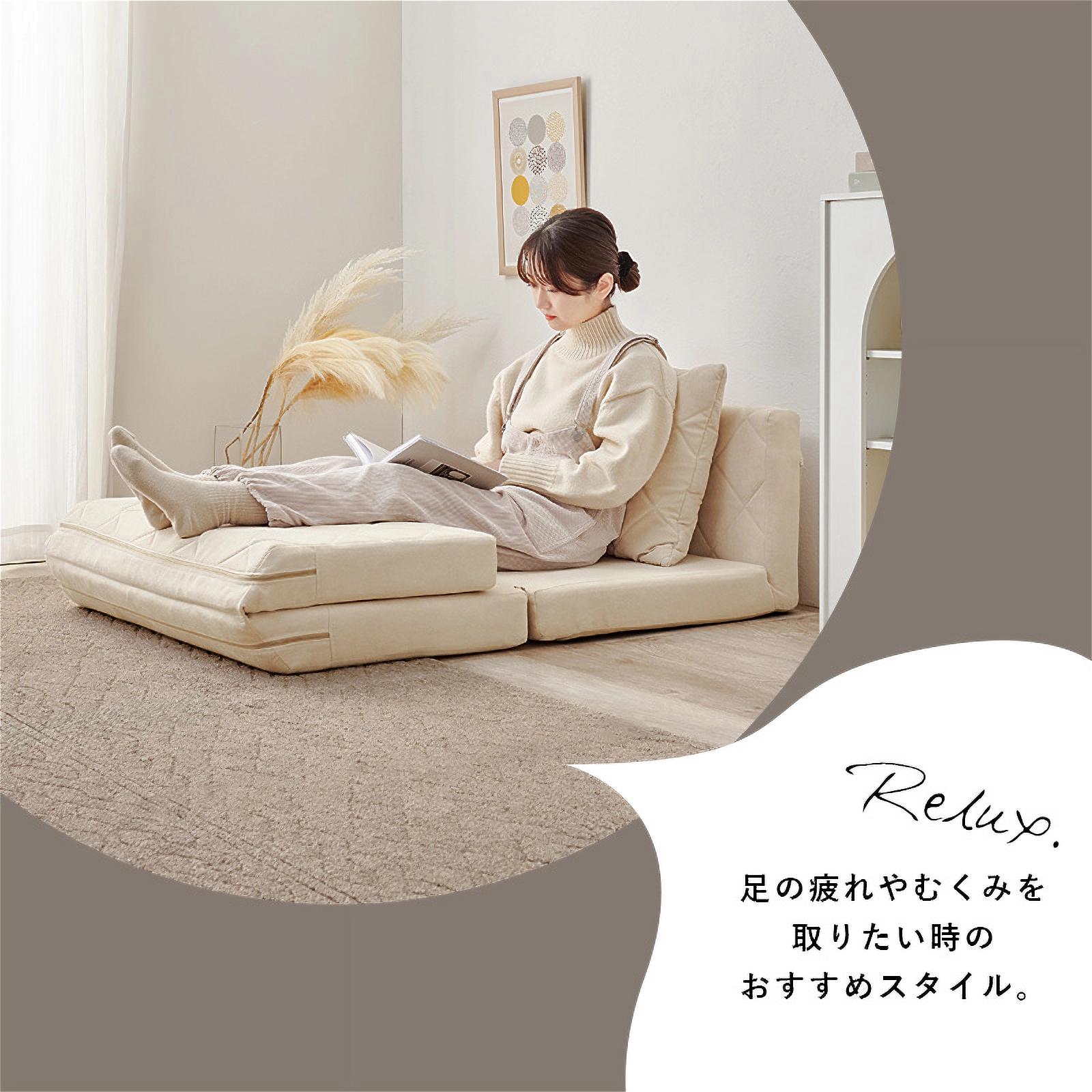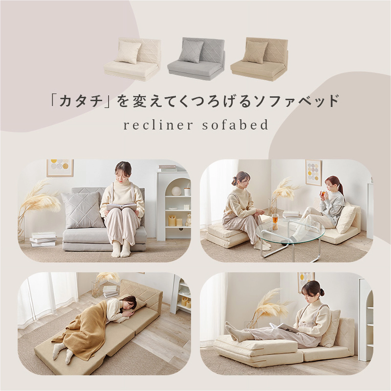 ソファとしてはもちろん、座面を広げれば簡易ベッドにも早変わり。女性でも簡単に形を変えられる手軽さで、急な来客やリラックスタイムにも大活躍です。