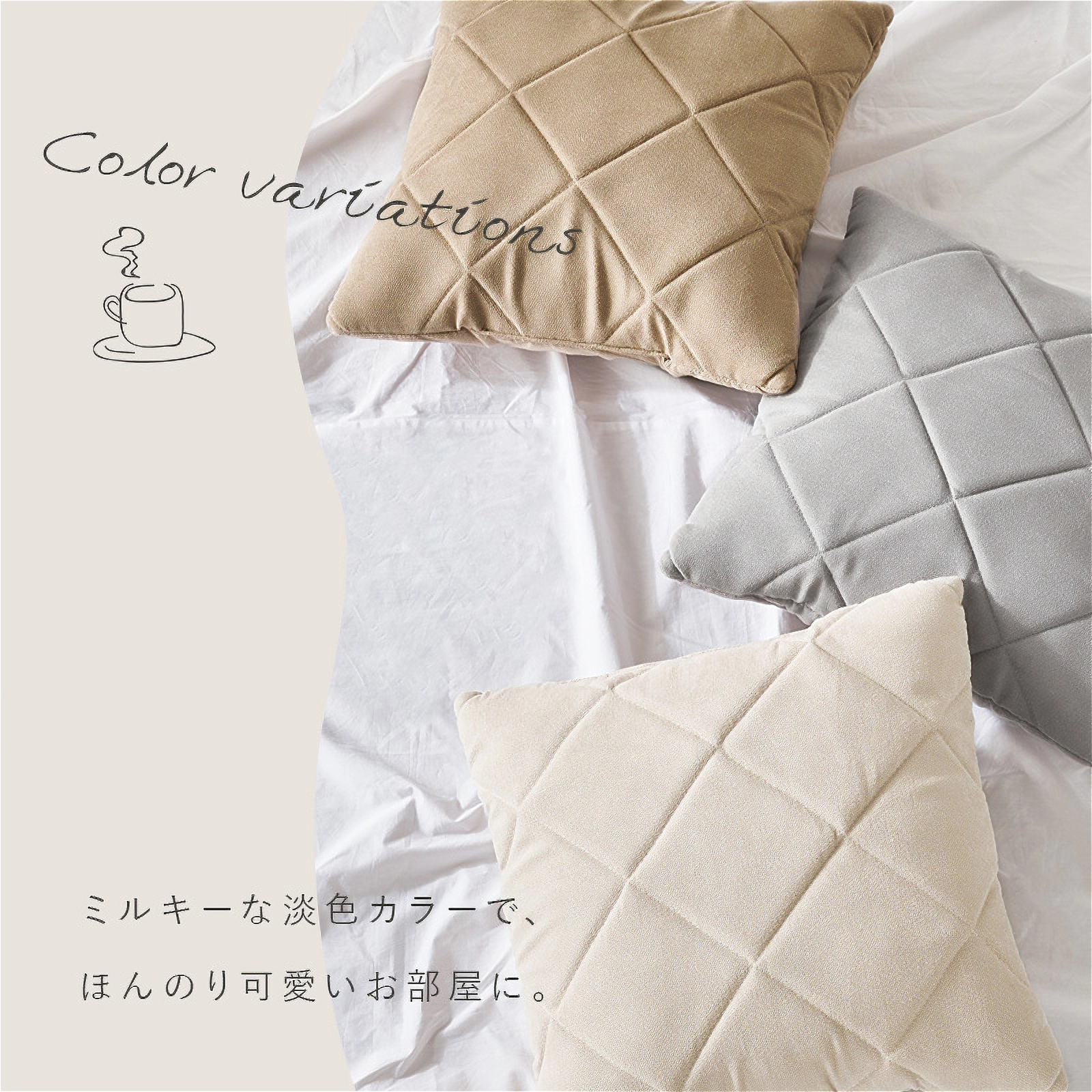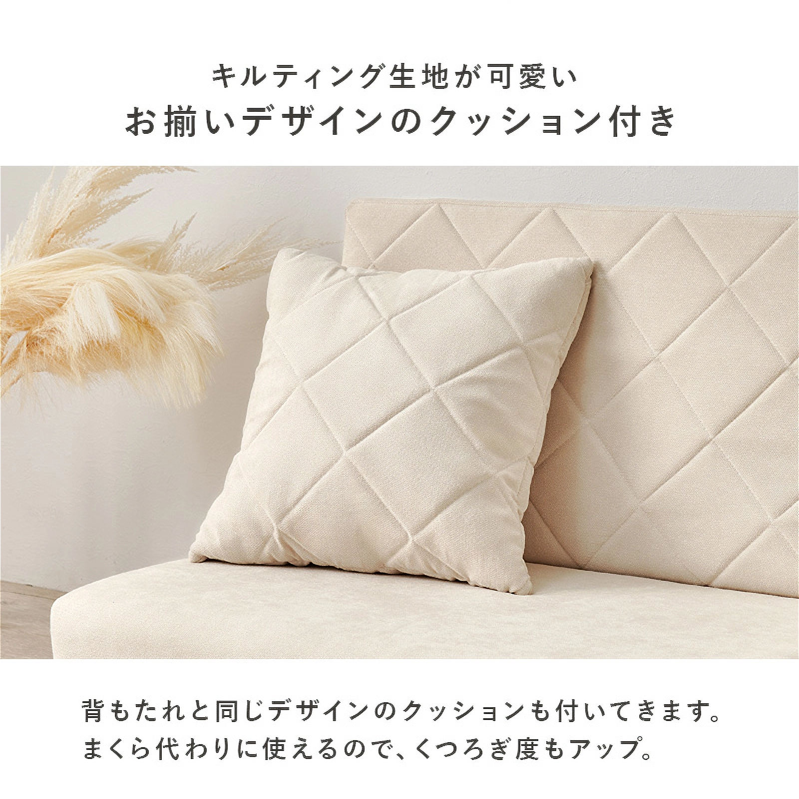 背もたれには上品なキルティング加工を施し、淡色トーンの3カラー展開でインテリアにも自然に馴染みます。付属のクッションとともに、見た目にも座り心地にもこだわった仕上がりです。