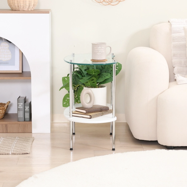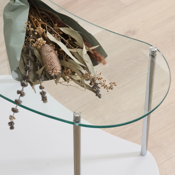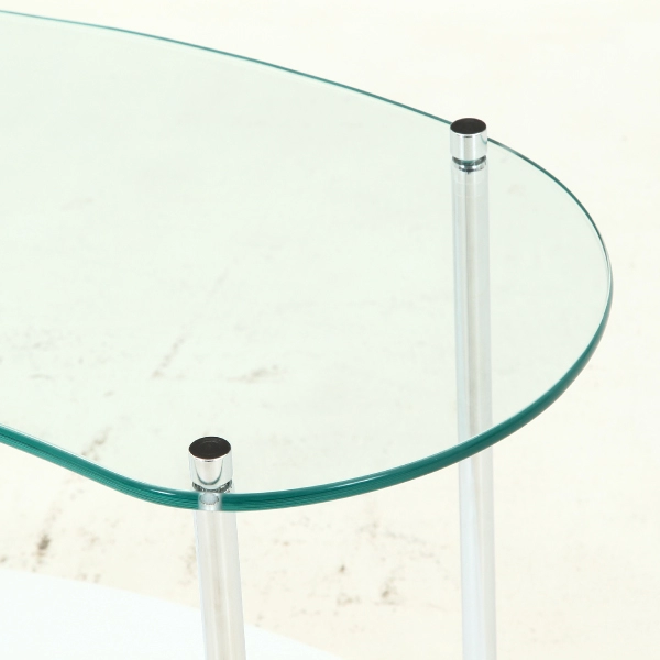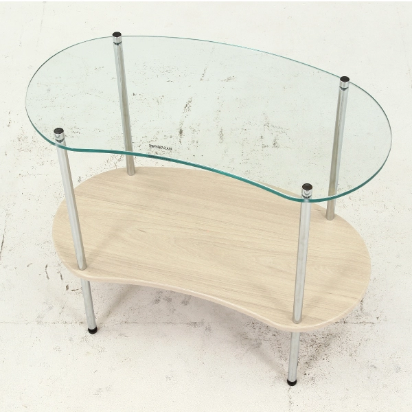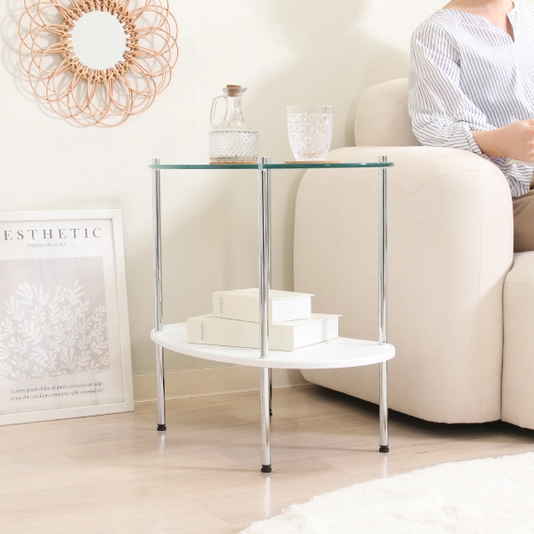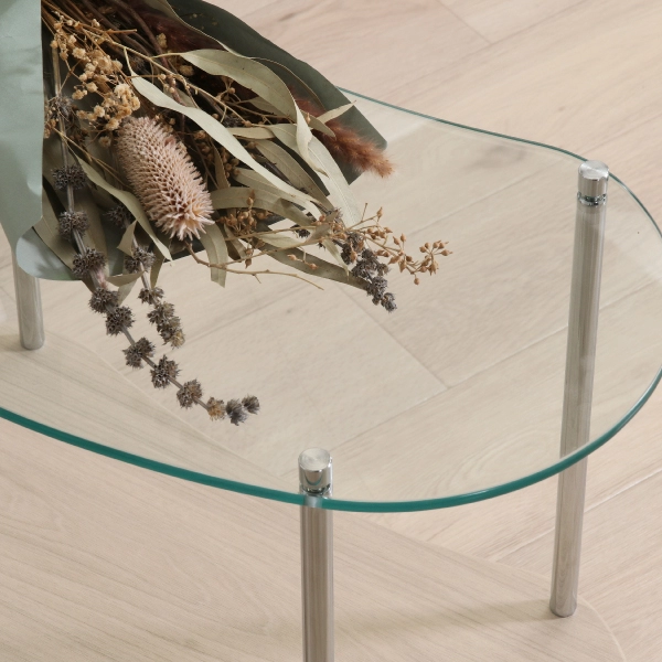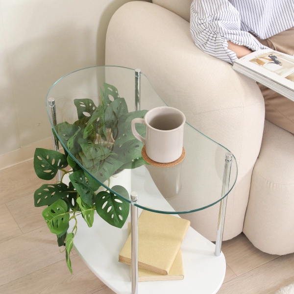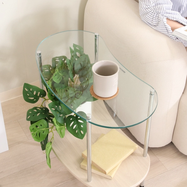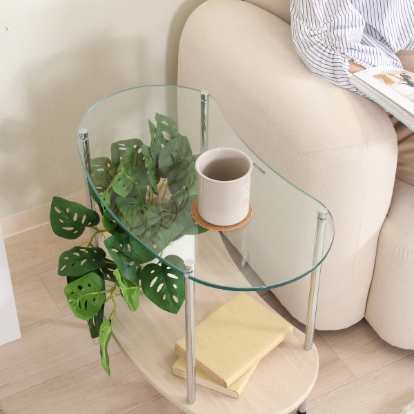 丸みを帯びたフォルムとガラスの透明感が絶妙にマッチした、ガラスサイドテーブル。主張しすぎず、暮らしに自然と溶け込むデザインで、インテリアの格上げにぴったりの一台です。