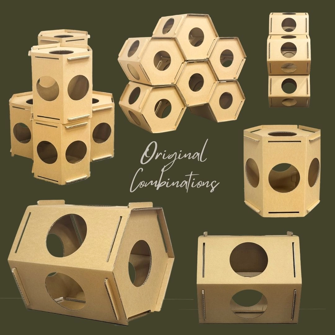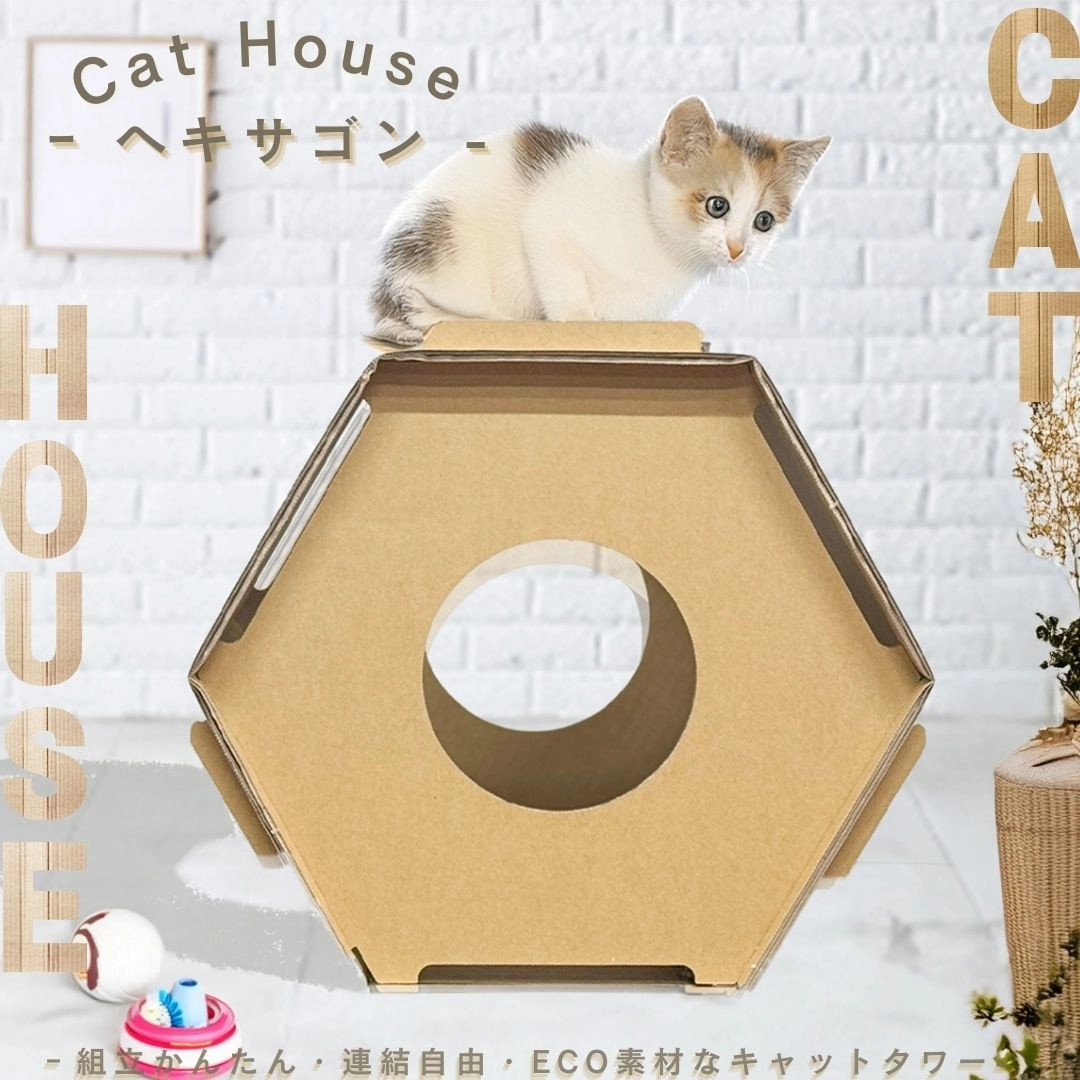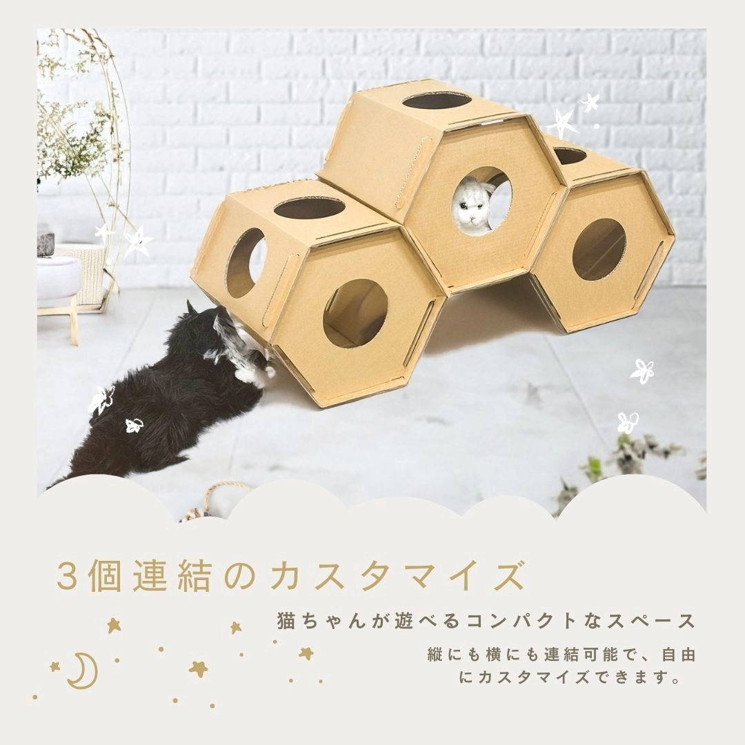 ユニークな六角形デザインが目を引く「ねこハウスヘキサゴン」。組み合わせ自在の段ボールハウスで、愛猫にぴったりの空間を手軽につくれます。