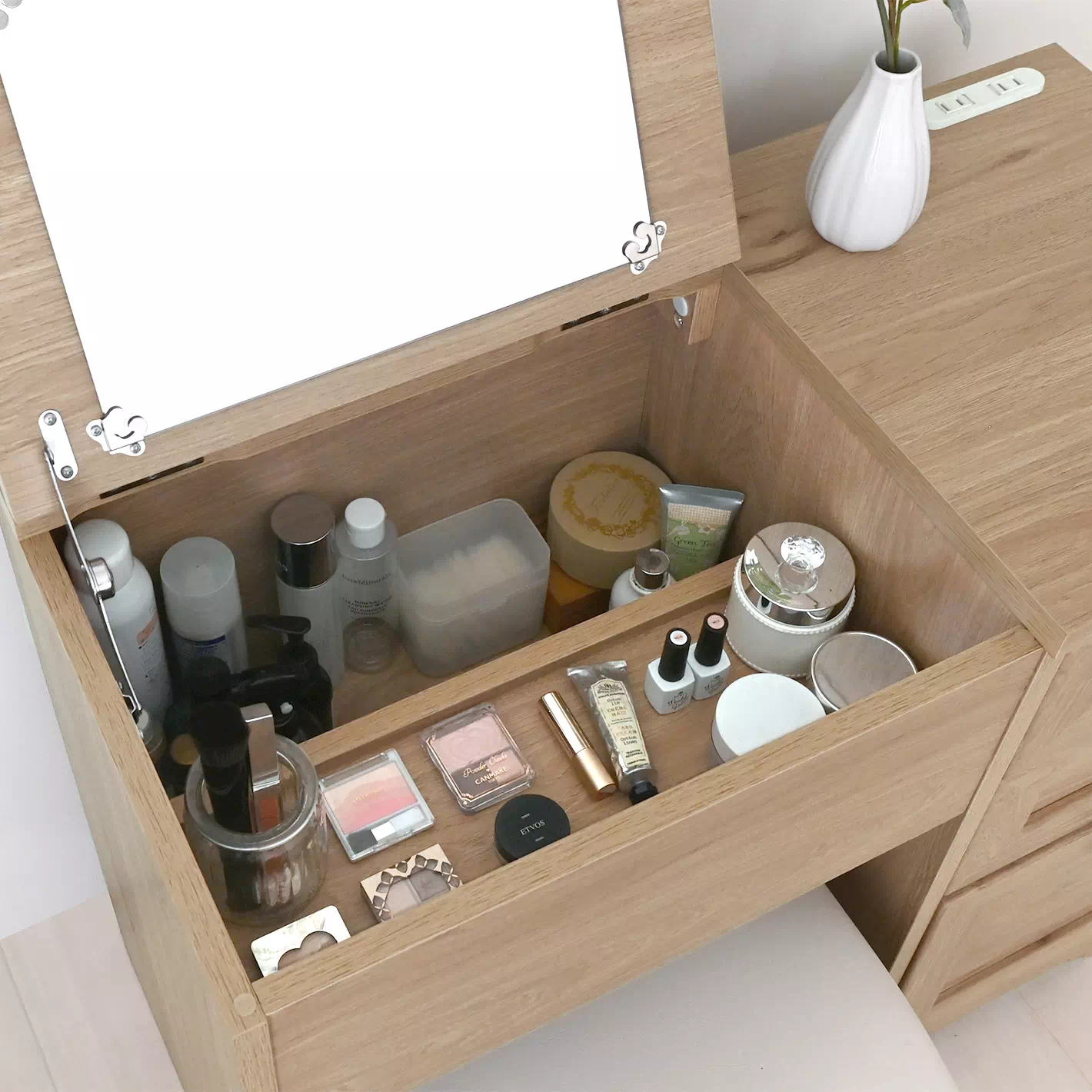 天板を開けると段付き収納スペースがあり、手前にはコスメ類、奥には高さのあるボトル類を収納できます。
