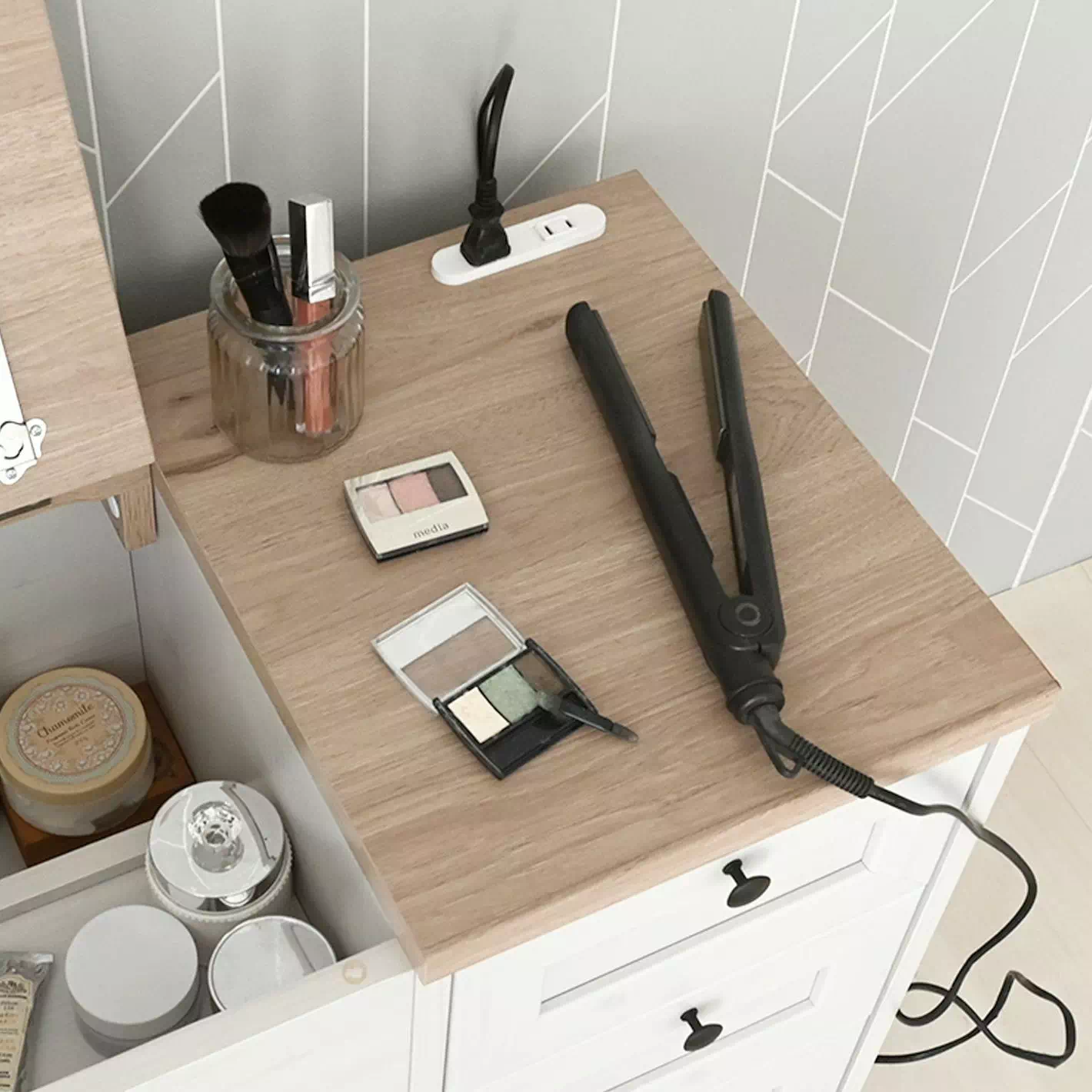 鏡も見やすいし、コテや充電コードもすぐに挿せるので買ってよかったです!