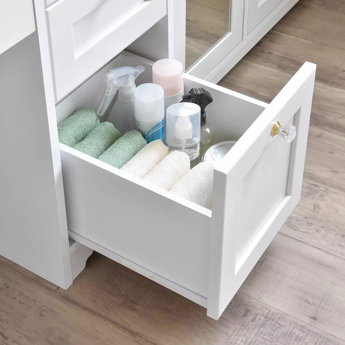 さらにサイズ違いの引き出し3杯付きで、アイテムごとに整理しやすく、生活感のあるものもすっきり隠せます。