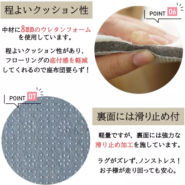 すべり止め付きで安心して使え、ホットカーペットや床暖房にも対応しています。