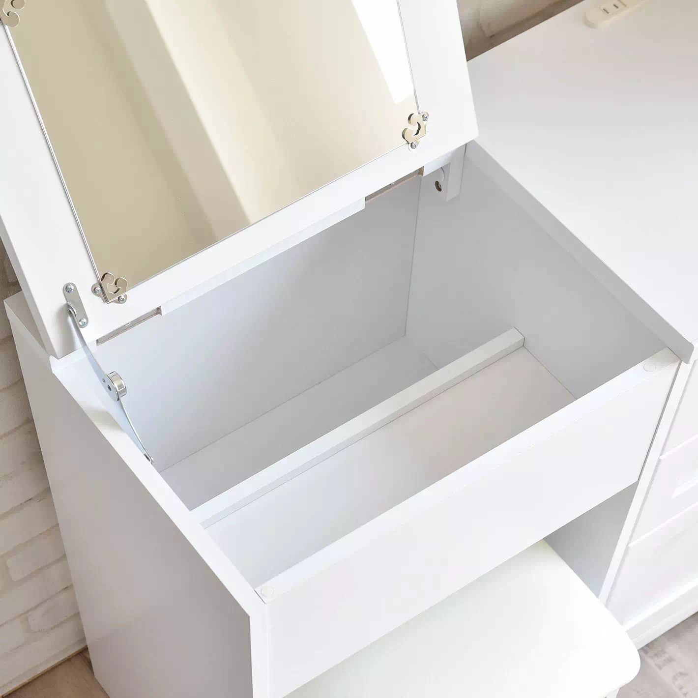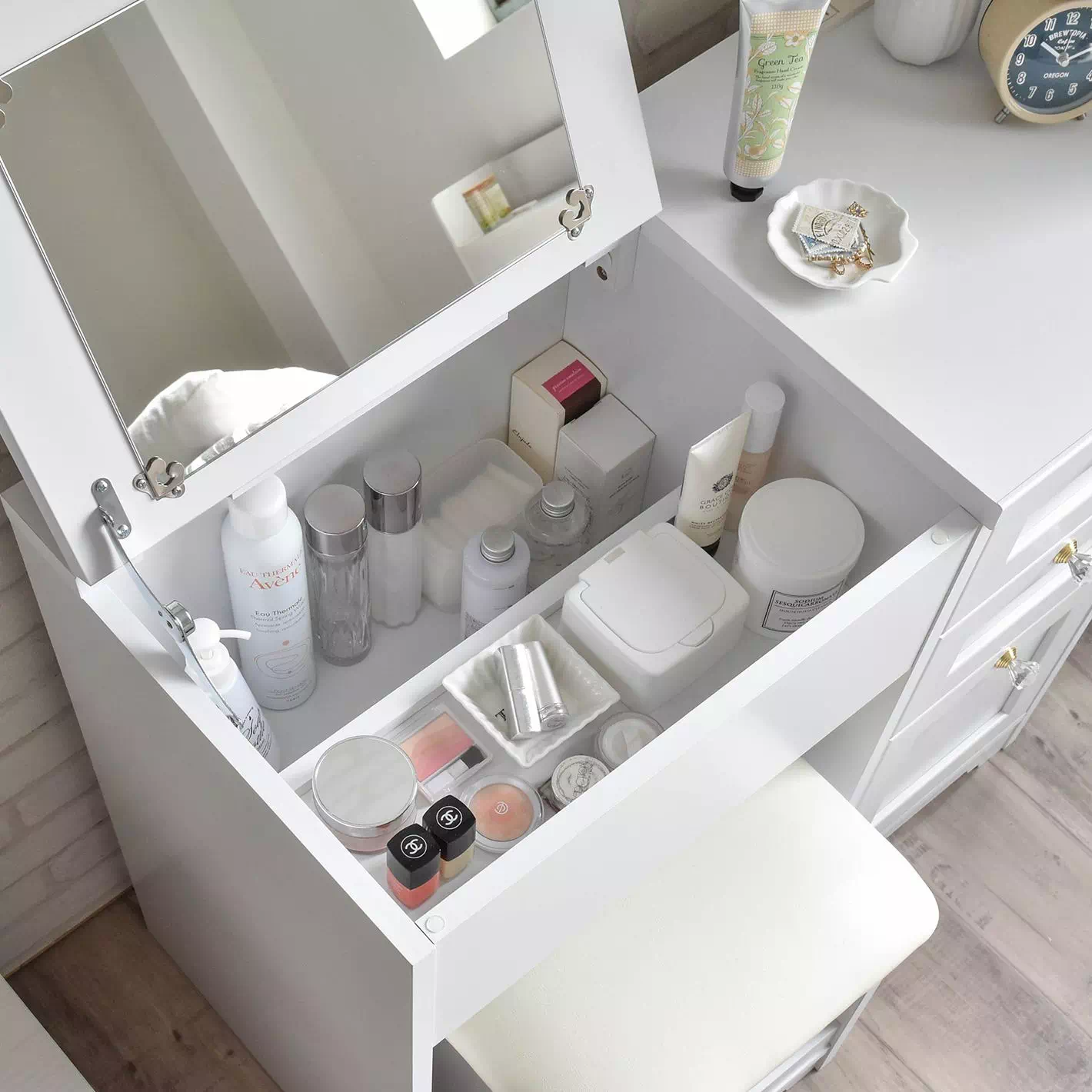 天板を開けると段付き収納スペースがあり、手前にはコスメ類、奥には高さのあるボトル類を収納できます。