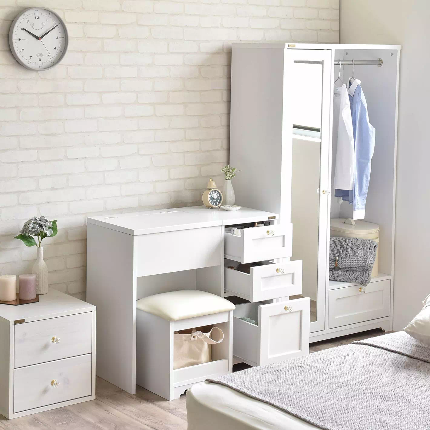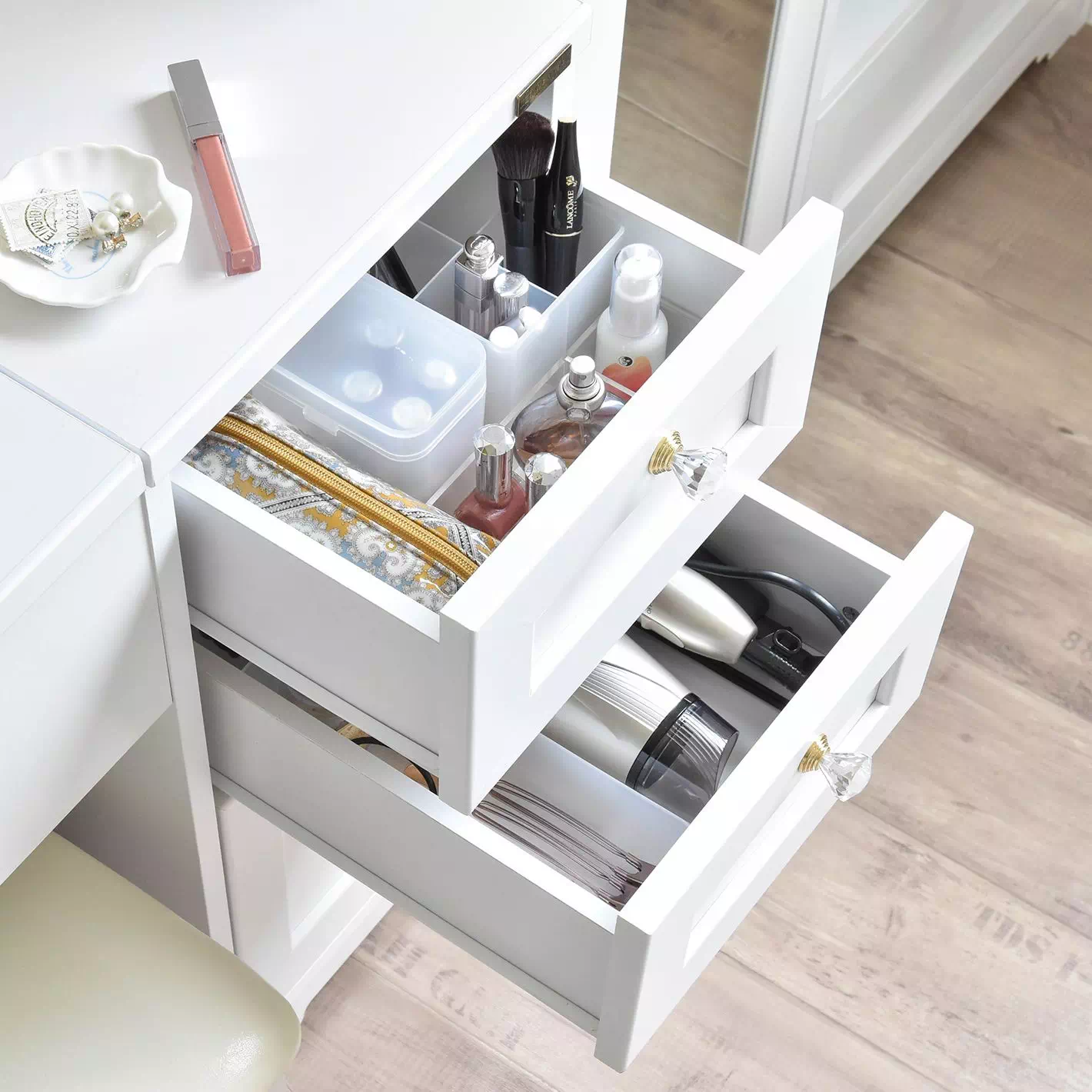 1台でドレッサーとデスクを兼ねられるので、ワンルームや限られたスペースでも無理なく設置できます。