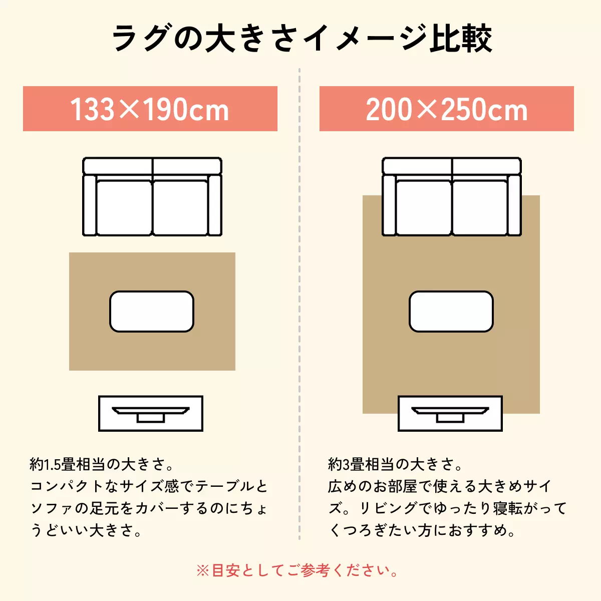 | サイズ | ・133×190cm(約1.5畳) ・200×250cm(約3畳) パイル長:23mm |